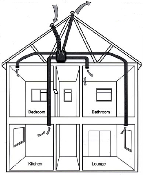Fresh filtered air is supplied to living rooms and bedrooms, while stale air is extracted from bathrooms, utility rooms and kitchen. |